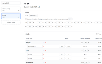 Gradebook, Chrome tarayıcısı için geliştirilmiş bir eklentidir. Bu araç, Brightspace ve Gradescope gibi platformlardan notları bir araya getirmenizi sağlar. Kullanıcılar, notlarını manuel olarak da girebilir ve mevcut not durumlarını takip edebilir. Uygulama, ödevlerin final notuna olan yüzdesel etkisini ve quiz kategorisindeki başarı durumunu analiz etme imkanı sunar.